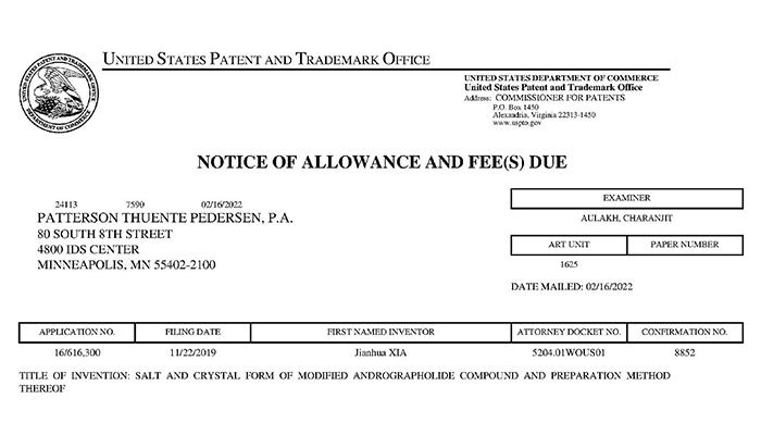 珍寶島藥業(yè)獲得穿心蓮內(nèi)酯改構(gòu)化合物美國專利授權(quán)通知書