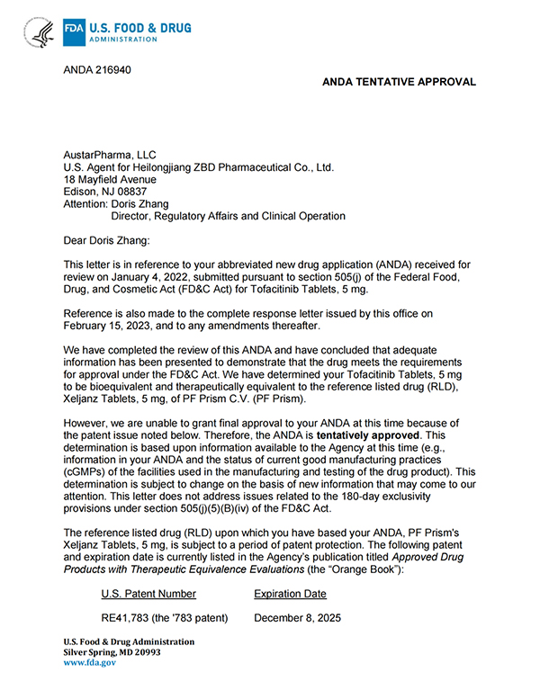 5月26日,珍寶島藥業(yè)發(fā)布公告,公司收到美國食品藥品監(jiān)督管理局(簡稱“美國FDA”)的通知,珍寶島藥業(yè)向美國FDA申報的枸櫞酸托法替布片的新藥簡略申請(ANDA,即美國仿制藥申請)已獲得暫時批準(暫時批準:指FDA已經(jīng)完成仿制藥的所有審評要求,但由于專利權或?qū)Yu權未到期而給予的一種批準形式)。