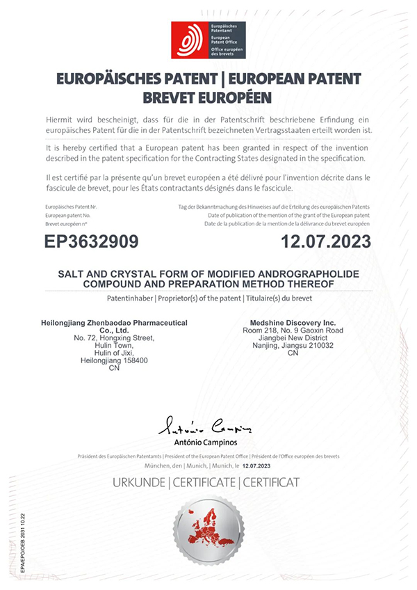 8月15日,珍寶島藥業(yè)發(fā)布公告。公司收到歐洲專(zhuān)利局頒發(fā)的內(nèi)容為《一種穿心蓮內(nèi)酯改構(gòu)化合物的鹽型、晶型及其制備方法》的專(zhuān)利授權(quán)證書(shū)。其國(guó)際專(zhuān)利申請(qǐng)?zhí)枮镻CT/CN2018/088168,專(zhuān)利權(quán)期限為申請(qǐng)之日起20年。